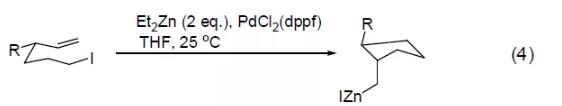 PdCl2(dppf) was also found to catalyze the iodine-zinc exchange reaction to obtain the intramolecular carbon zincation reaction of alkenes (Equation 4)[4].
