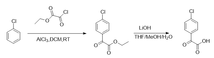 Dissolve ethyl 2-(4-chlorophenyl)-2-oxoacetate (4.0g, 18.9mmol) and lithium hydroxide (1.98g, 47.1mmol) in THF:MeOH:H2The mixture in O (76 mL, v/v/v=10:6:3) was stirred at 25°C for 3 hours. The mixture was neutralized with concentrated HCl to pH=2-3. The white precipitate formed was collected via filtration, washed three times with water and dried under vacuum to give (4-chlorophenyl)glyoxylic acid (3.0 g, 86%) as a white solid. MS(ES+)C8H5ClO3 required value: 184,186, measured value: 185,187[M+H]+.