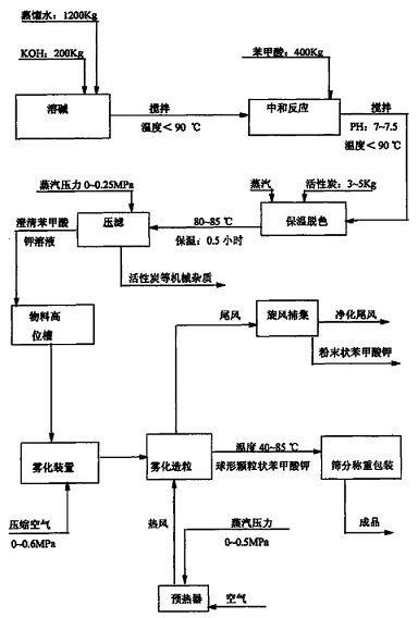 A method for manufacturing potassium benzoate, which is characterized in that: the manufacturing method of potassium benzoate includes an atomization granulation process; the atomization granulation process includes filtering the colorless, clear and transparent potassium benzoate solution Carry out atomization, use powdered potassium benzoate as crystal nuclei in the granulation tower, and blow the crystal nuclei with hot air at a temperature of 40 to 85°C in the granulation tower, so that the crystal nuclei and the atomized benzene The potassium formate reaction liquid is in contact with each other for granulation. The process flow is as follows: