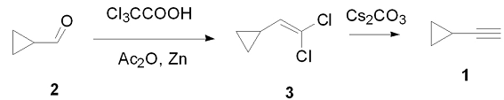 Considering the availability of raw materials and cost, the preparation method used before oral use is to use cyclopropyl methyl ketone as raw material and react with phosphorus pentachloride at low temperature to generate 1,1-dichloro-1-cyclopropyl Ethane is then used to obtain cyclopropylacetylene under the action of a base. This reaction has many by-products and the yield is only 34%-42%. The literature method uses cyclopropylformaldehyde as raw material, reacts with trichloroacetic acid, vinegar, and zinc powder to obtain 1-(2, 2-dichlorovinyl)cyclopropane, 1-(2, 2-dichlorovinyl)cyclopropane, Propane is eliminated under strong alkali conditions to obtain 1. The yield of this reaction has been greatly improved, but the flammable and explosive reagent methyl cannium needs to be used in the reaction, which is not conducive to industrial production. In order to simplify the synthesis process of 1, reduce the difficulty of synthesis, and improve the yield, this article optimized the synthesis process of 1 based on the literature, using carbonic acid instead of methyl cannium reagent, and optimizing the amount of alkali and reaction conditions. That is, cyclopropylmethylaldehyde (2) is used as raw material, reacts with trichloroacetic acid, vinegar and zinc powder to obtain 1-(2,2-dichlorovinyl)cyclopropane (3), 3 is reacted with carbonic acid 1 was synthesized through the reaction, with a total yield of 80% (see Figure 1 for the synthesis route), and its structure was confirmed by H NMR and C NMR.