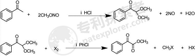The solvents used in the production process of 2,2-dimethoxyacetophenone are methanol, toluene, cyclohexane, etc. The solvents used in the production process of methyl benzoylformate are chlorobenzene, 1, 2-Dichloroethane and cyclohexane, etc. Preferably, the raw material for the halogenation elimination reaction of 2,2-dimethoxyacetophenone is chlorine or bromine. The material ratio in the production of 2,2-dimethoxyacetophenone is (weight ratio): acetophenone: hydrogen chloride: methyl nitrite = 1:0.3:1.1.