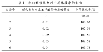 The addition of phase transfer catalyst enables the two phases immiscible with sodium methylmercaptide aqueous solution and p-chlorobenzaldehyde to react more fully. As can be seen from Table 1.��As the phase transfer catalyst is added, the yield of the intermediate gradually increases. However, when it reaches a certain level, the increase in the amount of catalyst does not promote the product yield, and causes post-processing difficulties and increased costs. The comprehensive cost considers the catalyst and The substance ratio of p-chlorobenzaldehyde is 0. 025:1 is the most suitable.