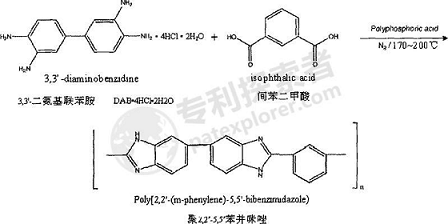 (1) Use polyphosphoric acid (PPA) (chemically pure, content: P2O5 ≥ 80.0wt%) as the solvent to perform a polycondensation reaction, add a certain amount of the above-mentioned PPA to a round-bottomed flask of a certain volume, and under nitrogen protection (flow rate: 40-50mL/min), heat and stir to raise the temperature to 140°C, slowly add a certain amount of 3,3′-diaminobenzidine (DAB·4HCl·2H2O, 97wt% ), dissolve 3,3′-diaminobenzidine in PPA and the HCl gas contained therein is completely volatilized, and slowly add the same amount of isophthalic acid (chemically pure, ≥99wt%);
