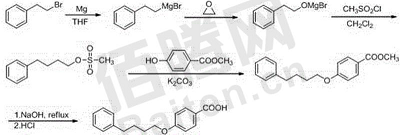 Using β-bromophenylene ethane as the starting material, 4-(4-phenylbutoxy)benzene is obtained through Grignard reaction, addition of ethylene oxide, mesylation, substitution and hydrolysis. Formic acid. This method has the characteristics of cheap and easily available raw materials, short process route, good product purity, high yield and low cost.Integrate industrial production.