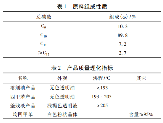 The output of paraxylene (PX), the raw material for the production of polyester, has increased significantly in recent years, and the PX unit has heavy aromatic by-products. In general designs, heavy aromatics are sent directly to gasoline and diesel storage tanks for blending. However, due to the low hydrogen-to-carbon ratio and wide distillation range of heavy aromatics, they affect the dry point of gasoline, reduce the cetane number of diesel and contain condensed rings in the fuel exhaust. Due to aromatic hydrocarbons and other reasons, it is not suitable for internal combustion engine fuel. A domestic refinery unit makes full use of the heavy aromatic hydrocarbons produced by the PX unit. Through distillation, freeze crystallization, centrifugal separation and other processes, it can separate the heavy aromatic hydrocarbons that are not easily utilized into 1# solvent oil, 2# solvent oil, 3# solvent oil and so on. #The three types of solvent oils produced by products such as solvent oil and high value-added pylene tetramethylbenzene are all products in short supply in the market, and their added value is higher than the value of raw materials. Methyl tetramethylbenzene is a high value-added fine chemical raw material. The heavy aromatics raw material used in the unit is a by-product of the aromatics complex unit of the refinery, and its composition is shown in Table 1. The physical and chemical indicators of the produced products are shown in Table 2.
