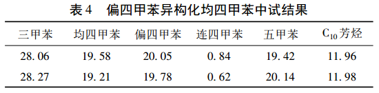 On the basis of the small-scale trial, a pilot plant with an annual output of 50 t was carried out. The isomerization reactor was a 1000 L enamel kettle, the one-time feeding volume was 300 kg, the reaction temperature was 120 ℃, the reaction time was 4 h, and 20% was added (ω) trimethylbenzene, the catalyst addition amount is 0. 9 kg. The experimental results are shown in Table 4.