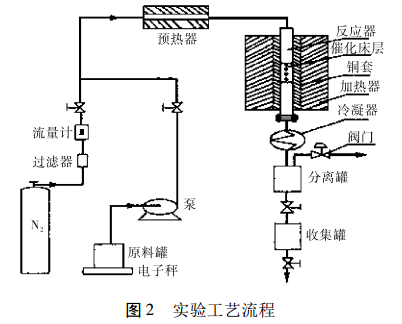 Experiments generally use a tubular isothermal reactor with a copper sleeve on the outside of the tube. The catalyst is evenly mixed with the same porcelain ring at a ratio of 1:1 (V/V). The upper and lower parts of the catalyst bed are filled with porcelain rings. Trimethylbenzene and methanol are uniformly mixed in a certain ratio, then added to the raw material tank, and injected into the reactor by an advection pump. The process flow is shown in Figure 2.