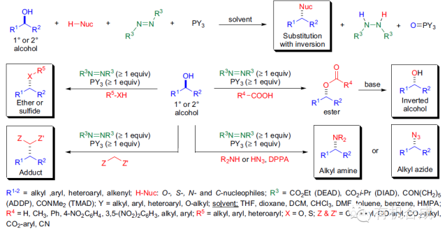 Mitsunobu reaction (Mitsunobu reaction) is a bimolecular nucleophilic substitution reaction (SN2 reaction). In 1967, Mitsunobu reported a new method for the condensation of acids and alcohols into esters under the action of triphenylphosphine (PPh3) and diethyl azodicarboxylate (DEAD). When the substrate is a secondary alcohol, the configuration of the carbon atom connected to the hydroxyl group will flip. After years of research and development, a large class of synthetic methods has been formed, which we call the Mitsunobu reaction. This type of reaction is widely used in organic synthesis, especially in the synthesis of natural products. The reaction can be expressed as: