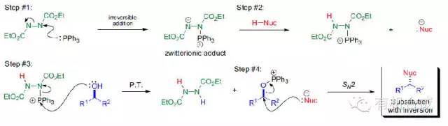 First, triphenylphosphine attacks DEAD to form an intermediate, seizes the carboxylic acid proton to form a positive ion, the nucleophile attacks the phosphine center of the ion to form a phosphine oxide ion, and DEAD falls off to form a by-product of hydrazine. Although many phosphine intermediates are involved in the reaction, step 4 is the only way to form the product and the triphenylphosphine oxide by-product is finally obtained.