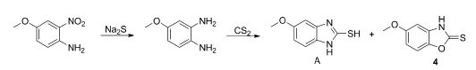 4-Methoxybenzo[D]oxazole-2(3H)-thione can be used as a pharmaceutical intermediate to synthesize other compounds with certain activity, but its application has been rarely reported. The analog of 4-methoxybenzo[D]oxazole-2(3H)-thione [5-methoxybenzo[d]oxazole-2(3H)-thione] is omeprazole Key intermediate impurity, omeprazole is the first-generation benzimidazole gastric acid proton pump inhibitor developed by Swedish Astra Zen-eca Company. It is mainly used to treat peptic gastric ulcer and reflux gastritis. According to the “European Pharmacopoeia EP8.0”, there are 9 known impurities in omeprazole (A ~ I, Chart 1): Impurity A is the key intermediate of omeprazole 5-methoxy-1H-benzo [d] Imidazole-2-thiol, impurities B to I are process impurities and degradation impurities of omeprazole. Using 4-methoxy-2-nitroaniline as raw material, impurity A was synthesized through a two-step reaction of nitro reduction and carbon disulfide ring closure. The reaction process is as follows: