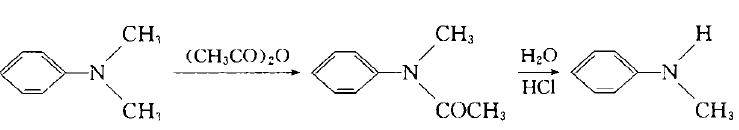 Add dimethyl sulfate dropwise into the mixture of aniline and water below 10`C. After stirring for 1 hour, add 30% sodium hydroxide solution dropwise, let it stand, separate the upper organic phase, and use benzene to separate the lower layer. After extraction, the oil obtained after recovering benzene from the extract liquid is combined with the organic phase, which is a mixture of aniline, N-methylaniline and N,N-dimethylaniline. Treat the mixture with sulfuric acid to make aniline form sulfate crystals and filter them out. N, N-dimethylaniline can be converted into N-methylaniline with acetate through the following reaction: