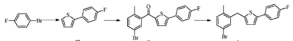 3) 2-(5-bromo-2-methylbenzyl)-5-( 4-Fluorophenyl)thiophene. The 5-bromo-2-methylphenyl-2-(4-fluorophenyl)thiophenone is subjected to a reduction reaction to obtain the target compound 2-(5-bromo-2-methylbenzyl)-5-( 4-Fluorophenyl)thiophene.