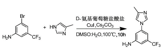 1) Add 3-amino-5-bromotrifluorotoluene, 4-methylimidazole, and D-aminotrifluoride in sequence in the reaction vessel.�� Glucose hydrochloride, CuI, Cs2CO3, DMSO and water, react at 90~110℃ for 8~12 hours. The molar ratio of the 3-bromo-5-trifluoromethylaniline, 4-methylimidazole, Cs2CO3, D-glucosamine hydrochloride and CuI is 1:1:1.8 ~2.2: 0.05 ~ 0.2: 0.05 ~ 0.2. The dosage of DMSO is 0.5~0.8L/mol 3-bromo-5-trifluoromethylaniline. The amount of water used is 0.5 to 0.8L/mol 3-bromo-5-trifluoromethylaniline.