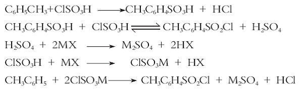 2) Synthesis of p-toluenesulfonyl chloride: equipped with stirrer, thermometer, gas distributor, condenser and