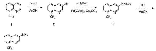 1. Used in the synthesis of 3-amino-8-trifluoromethylquinoline: 3-amino-8-trifluoromethylquinoline and its intermediates are important intermediates in organic synthesis and medicinal chemistry. Starting from these compounds, a series of candidate drug molecules with good pharmaceutical activity can be synthesized. The latest research shows that these candidate molecules, in addition to having anti-angiogenesis, anti-coagulation, anti-tumor and anti-tumor metastasis, and anti-diabetic retinal detachment activities, can also be used to treat diseases such as arthritis and irritable bowel syndrome. The synthesis method is as follows: 8-trifluoromethylquinoline reacts with N-bromosuccinimide in acetic acid to generate 3-bromo-8-trifluoromethylquinoline, and then reacts with tert-butyl carbamate in acetic acid. In the presence of palladium, 4,5-bisdiphenylphosphine-9,9-dimethylxanthene and cesium carbonate, the reaction generates 3-tertiary oxycarbonylamino-8-trifluoromethylquinoline. Finally, the compound is Deamination protection in a mixed solvent of hydrochloric acid and methanol gave 3-amino-8-trifluoromethylquinoline. The reaction equation is as follows:
