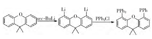Under anhydrous and oxygen-free conditions, 9,9-dimethylxanthene and sec-butyllithium react in a dehydrated diethyl ether solvent to remove the two hydrocarbons on the benzene ring to generate dilithium 9 , 9-dimethylxanthene. In diethyl ether as the solvent, dilithium 9,9-dimethyloxanthene further reacts with diphenylphosphine chloride to generate 4,5-bisdiphenylphosphine-9,9-dimethyloxanthene. anthracene. This compound can be stored in the air for a long time, is easily soluble in methylene chloride, and is insoluble in petroleum ether and other solvents. The reaction formula is as follows: