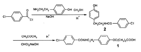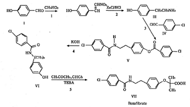 Method2:Use p-chlorobenzoyl chloride and p-hydroxyphenylethylamine as raw materials to first synthesize N-p-hydroxyphenylethyl -4-Chlorobenzamide is then condensed with acetone and chloroform in toluene under phase transfer catalysis to obtain bezafibrate: