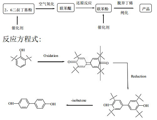 Preparation example: Add a mixture of 200g (0.968mol) of 2, 6-di-tert-butylphenol and 2g of 50% potassium hydroxide aqueous solution. In an autoclave with stirrer and thermostat. Heat to about 180°C and add oxygen until the internal pressure reaches 0.71Mpa. During this period, stirring was carried out at a speed of 460r/min. There is a slight exotherm in the initial stage, the temperature rises to about 200°C, and the oxygen pressure drops sharply to 0.53Mpa. During the 35min reaction time, oxygen was injected several times to bring the internal pressure to 0.71Mpa. After reacting for 35 minutes, the inside of the reactor was purged with nitrogen, and the product was analyzed by chromatography. Approximately 75% of the substituted phenol was converted into dimers. Then, the temperature of the reactant was raised to 300°C, and unreacted 2,6-di-tert-butylphenol was distilled off. As the dealkylation reaction proceeds, the temperature rises to 320°C and the by-product isobutylene is removed. After reacting for 4 hours, distill 4, 4, –biphenyldiol, to obtain a snow-white product with excellent quality.
