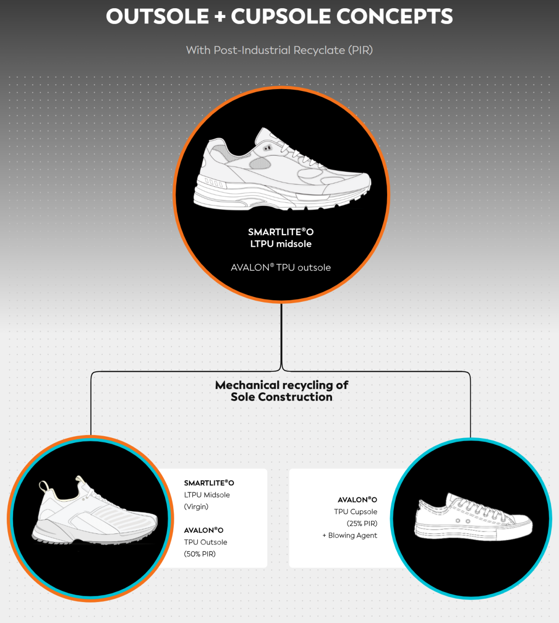 LTPU components are blended with original TPU to create a new outsole and cup sole. can also make a bio-based version of the material.