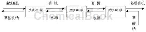 (2) Back extraction: As shown in Figure 1, it is a flow chart of the saponification-free iron stripping method. The iron-rich organic extractant P204 (iron ion content is 15g/l) enters the extraction box from anti-iron 01 level. , at the same time, the sodium oxalate solution enters from the sodium oxalate low-level tank through the anti-iron 03 stage. The flow ratio of the sodium oxalate solution to the organic extractant loaded with iron ions is 2.9:1. After three-stage stripping, the saponified organic extractant is obtained. After entering the system for recycling, sodium ferric oxalate is discharged from the system through the water phase and can be taken away as a by-product. During specific use, the anti-iron series can be set according to the iron content in the organic matter. After stripping the iron-rich organic extractant, Fe is less than 15 mg/l.