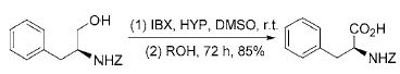 The aldehyde will not be further oxidized to carboxylic acid. However, in the presence of O-nucleophiles such as 2-hydroxypyridine (HYP), N-hydroxysuccinimide (NHS) or 1-hydroxybenzotriazole (HOBt), IBX Primary alcohols can be directly oxidized to carboxylic acids at room temperature, with a yield of 64% to 95%. This reaction can be used to directly oxidize N-protected β-amino alcohols to the corresponding amino acids without racemization: