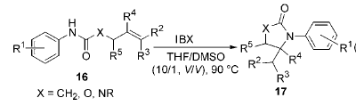 1) Application of IBX in ring-closing reactions of unsaturated N-aryl amides, carbamates, and ureas: methods for constructing C—N bonds are: through N-nucleophilicity Substitution of O-functional groups by reagents, rearrangement of carbonyl functional groups, and reductive amination, etc. However, there are few methods to directly connect N to C without O connection without producing harmless by-products. It is obtained by reacting IBX with unsaturatedN-arylamide, carbamate, and urea. Various nitrogen-containing five-membered heterocyclic compounds use this method to selectively connect the N-functional group to the unactivated olefinic bond to form