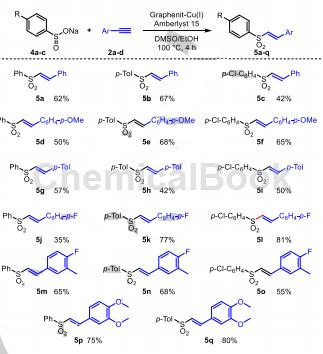Phenyl TRANS-styryl sulfone is prepared as follows: In a vial, dissolve sulfonate 4 (1.5 equiv), Amberlyst 15 (140 mg) and graphene-copper(I) (5%) in DMSO:EtOH1 :1. Seal the vial and suspend in the Vortex system for 3 minutes at room temperature. Alkyne 2 (1 equiv) was added and the reaction was maintained at 100°C with continuous stirring. After 24 hours, the crude reaction product was filtered through HPLC filter. The organic phase was dried over Na2SO4, and the solvent was removed under reduced pressure to obtain the desired products 5a-5q. (where 5a is phenyl TRANS-styryl sulfone).
