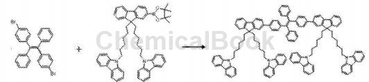 Place 1,2-bis(4-bromophenyl)-1,2-diphenylethylene and 2-(4,4,5,5-tetramethyl-1,3,2-dioxa Pentaborane)-9,9-(N-carbazole-hexyl)fluorene, chromatographically pure toluene, sodium carbonate aqueous solution (2M/L), and absolute ethanol were placed in a round-bottomed flask, and the catalyst Pd ( PPh3)4, the reaction system was refluxed and stirred at 90°C for 48 hours. After the reaction was completed, the system was cooled to room temperature, an appropriate amount of water was added to the system and then dichlorinated with After extraction with methane, the extract was concentrated and separated by column chromatography (eluent was petroleum ether: dichloromethane 4:1) to obtain the target product as a light yellow solid.