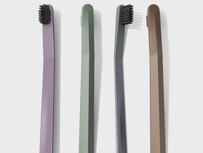 The toothbrush is made from industrial compostable polylactic acid (PLA) and