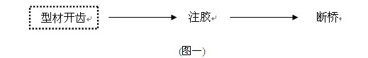 Aluminum profile glue injection technology (hereinafter referred to as glue injection technology ) is a technology that produces polyurethane-injected heat-insulating aluminum profiles (hereinafter referred to as glue-injected aluminum profiles) by injecting polyurethane material into the aluminum profile heat-insulating groove and breaking the bridge after the polyurethane material solidifies. The process diagram is as follows (for compatible Aluminum profiles with good properties can save the tooth opening step):