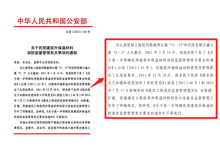 In order to conscientiously absorb Shanghai Jiaozhou Road Teachers Apartment<font face Lessons learned from the "11·15" and "2·3" fires in Shenyang Dynasty Wanxin Building. On March 14, 2011, the Ministry of Fire Protection Bureau issued the "About Further Clarifying the Fire Supervision and Management of External Insulation Materials for Civil Buildings" "Notice on Requirements" (public notice [2011] No. 65), which puts forward emergency requirements for the use and management of building exterior wall insulation materials. On December 30, 2011, the State Council issued the "Opinions of the State Council on Strengthening and Improving Fire Protection Work" (Guofa [2011] No. 46) and the newly promulgated "Regulations on Fire Protection Supervision and Management of Construction Projects" on July 17, 2012. Clear provisions are made on the fire protection performance and supervision and management of external insulation materials used in new construction, expansion and reconstruction construction projects. After research, the "Notice on Further Clarifying the Relevant Requirements for Fire Supervision and Management of Exterior Insulation Materials for Civil Buildings" will no longer be implemented.