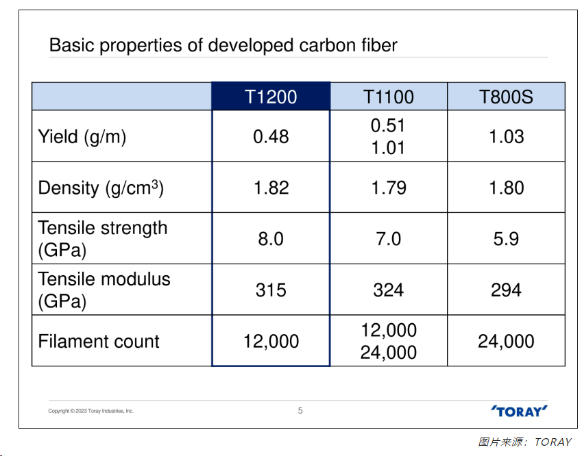 T1200 is a 12K small tow product with a tensile strength of 8.0 Giga Pascal (or GPa, approximately 100 kilograms of force per square millimeter). From the data in the table, it can be found that the tensile strength of the new product is higher than that of TORAYCA™