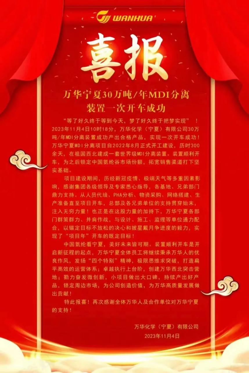 Recently, Wanhua Chemical (Ningxia) Co., Ltd.’s 300,000 tons/year MDI separation unit successfully produced qualified products and achieved a successful start-up in one go!