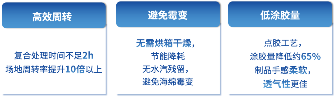 Compared with the traditional environment-friendly glue, the 6019 series products help customers reduce costs and improve efficiency with more efficient and rapid composite processing, automated sponge composite production lines and fast-paced site turnover.