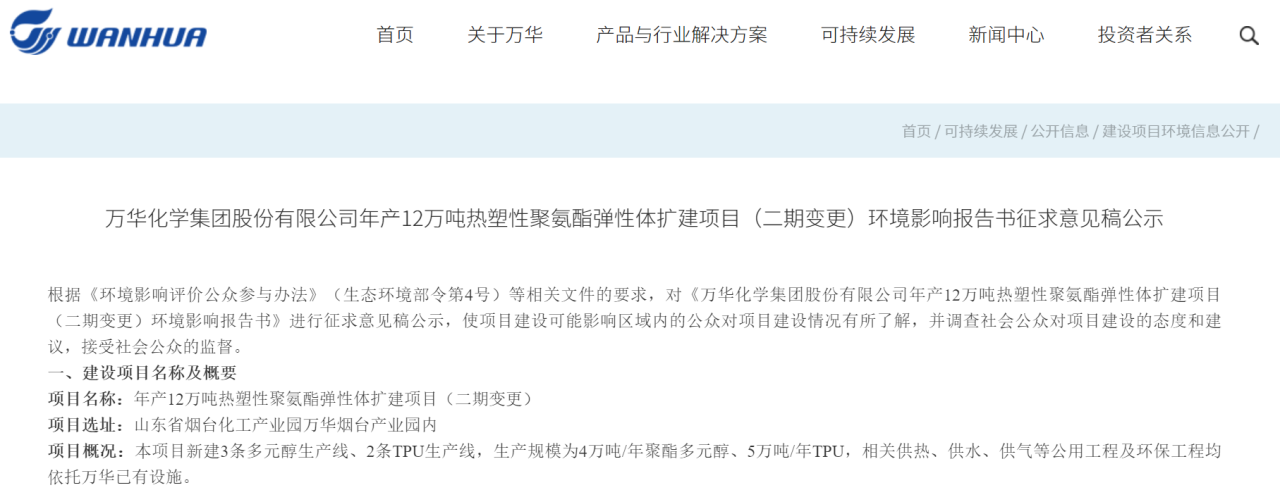 Recently, the draft environmental impact report of Wanhua Chemical Group Co., Ltd.’s 120,000-ton thermoplastic polyurethane elastomer expansion project (phase two changes) per year was released.