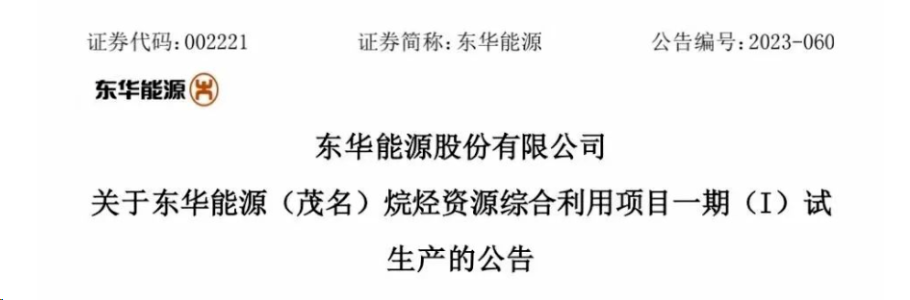 On September 27, Donghua Energy announced that the first phase (I) of Donghua Energy (Maoming) Propane Resources Comprehensive Utilization Project includes a set of propane dehydrogenation units with a design capacity of 600,000 tons/year, and a set of 400,000 tons/year propane dehydrogenation unit. Ton/year polypropylene equipment, public works and supporting facilities obtained trial production (use) registration for hazardous chemicals construction projects on September 15, 2023. Qualified polypropylene products have been produced and the equipment is operating smoothly.