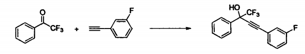 The addition reaction of trifluoromethyl ketone and terminal alkynes is widely used in the synthesis of drugs, pesticides and organic functional materials. There are two reasons why this type of reaction is important: (1) There is an alkyne bond in the product , can be further functionalized, and is therefore an important type of organic synthesis intermediate; (2) while forming a carbon-carbon, a CF3 group is introduced into the target molecule, which is a potentially biologically active and special A group of physical properties, because 30% of currently synthesized drugs and 20% of pesticides contain fluorine atoms. The synthesis example is as follows: