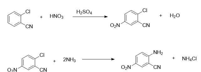 A1. Put 100g o-chlorobenzonitrile into 333g sulfuric acid medium, then add mixed acid dropwise, and perform nitrification at 5-10°C to obtain nitrate; the mixed acid is HNO3 and H2SO4 is mixed with a mass percentage of 0.5:1;