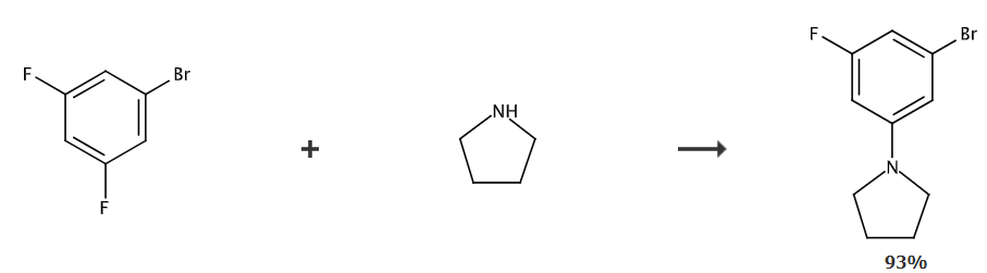 Add 1-bromo-3,5-difluorobenzene (1.00g, 5.18mmol), pyrrolidine (0.47mL, 5.7mmol), DEPEA (1.4mL, 7.77mmol) and NMP (6.9mL) to the tube middle. The tube was sealed and stirred at 100°C overnight. The reaction mixture was diluted with water and EtOAc. The aqueous layer was back extracted with EtOAc (3x). The combined organic layers were then washed with H2O, 1N HCl (2x), saturated NaHCO3, H2O and brine, then Dry with Na2SO4. The material was filtered and concentrated under reduced pressure to obtain 1.178 g of solid, a crude yellow solid.