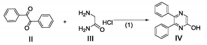 Under nitrogen protection, add benzoyl (2.10g, 0.01mol), aminoacetamide hydrochloride (1.32g, 0.012mol) and NaOH (0.96g, 0.024mol) in sequence to 20mL of methanol solvent , heated to reflux for 3 to 4 hours, and the reaction was monitored by LC-MS. The reaction of the raw materials was complete. Cool the reaction solution to 0~5°C, then add 12N HCl (1.25mL) solution dropwise, and stir the reaction solution at room temperature for 30 minutes, then add 1g sodium bicarbonate and 13mL water, filter the reaction solution, add water (5mL) and methanol (5mL), the solids were washed separately and dried under vacuum to obtain 2.20g of white solid 5,6-diphenyl-2-hydroxypyrazine, yield: 88.7%, ESI-MS: m/z=249.2(M+H)+.