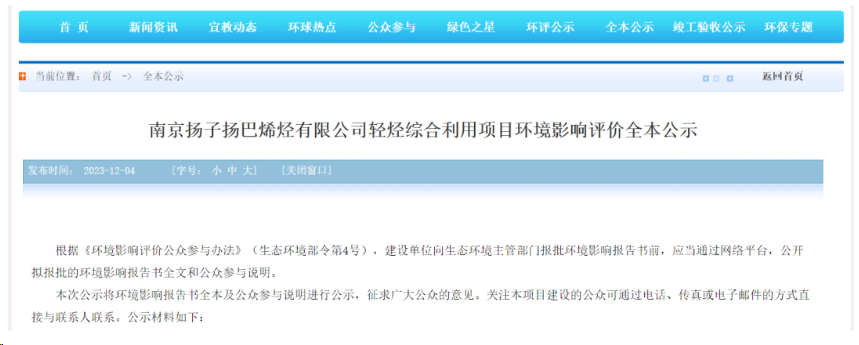 On December 4, the Jiangsu Environmental Protection Public Network released the full environmental impact assessment of the light hydrocarbon comprehensive utilization project of Nanjing Yangzi Yangba Olefins Co., Ltd.