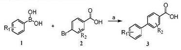 Method 1: Preparation of 4-bibenzoic acid. Under argon protection, add 2.75g (13.8mmol) of 4-bromobenzoic acid, 2g (16.4mmol) of phenylboronic acid, 2.71g of K2CO3 (27.3mmol), and 0.2g of tetrakistriphenylphosphorus palladium to 40 mL of dioxane In cyclic solvent/water (10:1), the temperature was raised to 75°C, and TLC monitored the reaction to be complete after 5 hours. The reaction solution was cooled, filtered with suction, and the pH value was adjusted to 2-3. A large amount of white solid was generated. 2.30g of 4-biphenylcarboxylic acid was obtained as a white solid by suction filtration, with a yield of 84.9%. MS[M+H]+(m/z): 199.2.