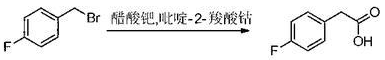 Method 2: Add 312ml of methanol, 0.55g of cobalt pyridine-2-carboxylate, and 1.37g of palladium acetate into the autoclave reaction kettle, stir for 5 minutes to dissolve the catalyst, replace the air in the kettle with CO three times, and raise the temperature. to 180°C, and pour in CO until the pressure rises to 1.5MPa. Within 1 hour, simultaneously add 57.8g (0.4mol) p-fluorobenzyl and 160g (1.2mol) 30% NaOH dropwise into the reaction kettle. After 5 hours of reaction, cool to room temperature, remove methanol by distillation under reduced pressure, filter out the catalyst, add 30% hydrochloric acid to adjust the pH to 1, filter and dry to obtain 4-fluorophenyl acetic acid, with a purity of 99.40% and a yield of 84%. .