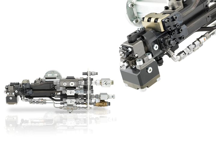 Importantly, the nozzle change module is fast. For example, if the user starts with a flat nozzle and sprays the loading floor completely, compressed air is used to clean the discharge channel in about 3 seconds. Changes to the circular nozzle itself are performed hydraulically by pushing the secondary channel geometry into position. This only takes about 100 milliseconds and the process continues. Mixing heads are equipped with spring-loaded nozzles or nozzles with various devices to be able to handle variable amounts of material. The latter works with an air cushion located in an air chamber behind the nozzle. In the event of fluctuations in component throughput, various nozzles can better balance pressure and achieve optimal process parameters at different discharge rates.