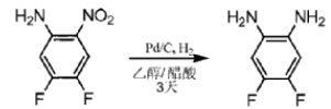 Mix 4,5-difluoro-2-nitroaniline (10g, 57.4mmol), 10% Pdoncarbon (1g) and 100mL methanol together and add it to a reaction bottle filled with nitrogen. Then add 20 mL acetic acid and vent hydrogen gas for 1 minute. The reaction was then left to react at room temperature for 3 days. The Pd catalyst was removed by filtration. The filtrate was collected and distilled under reduced pressure. Then chloroform was added to dissolve the residue. After repeated extraction with saturated Na2CO3 solution three times, it was dried with MgSO4. The organic phase was filtered, the filtrate was collected, and the solvent was evaporated to obtain a brown solid. 1HNMR (400MHz, CDCl3): δ6.51 (t, 2H), 3.33 (br, 4H).