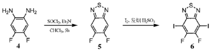 1) Add 0.2g 4,5-difluorobenzene-1,2-diamine (1.38mmol), 20mL chloroform, and 0.57mL triethylamine (5.6mmol) into a round-bottomed flask. Then 0.36g thionyl chloride (2.8mmol) was added dropwise and refluxed for 5 hours. After returning to room temperature, extract with dichloromethane three times, combine the organic phases, dry the organic phases with MgSO4, and evaporate the solvent to obtain 0.2g of white needle-like crystals. 1HNMR (400MHz, CDCl3): δ7.74 (t, 2H, J=8.7Hz).