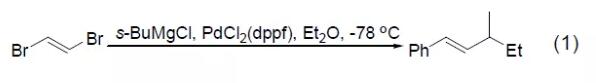 Similar to other Pd(II) and Ni(II) complexes, PdCl2(dppf) can effectively catalyze the cross-coupling reaction between halogenated alkenes, halogenated arenes or triflate aromatics and Grignard reagents. Achieve the formation of carbon-carbon bonds. Vinyl bromide and s-BuMgCl can react completely under the catalysis of PdCl2 (dppf) to obtain the coupling product (Formula 1)[1], but using other Pd catalysts will lead to isomeric products and reduction by-products.