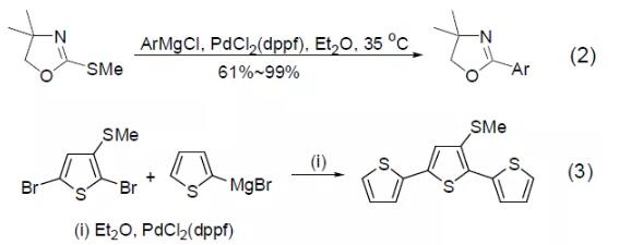 Although ordinary Pd catalysts do not have the ability to activate organic sulfur compounds, PdCl2 (dppf) can realize the cross-coupling reaction between methyl sulfide and aryl Grignard reagents (Formula 2)[2]. Bromothiophene and thiophene Grignard reagent can obtain photosensitive trithiophene compounds under the catalysis of PdCl2 (dppf), and the methyl sulfide substituent in the substrate will not react (Formula 3) [3]. 【Kumada coupling reaction】
