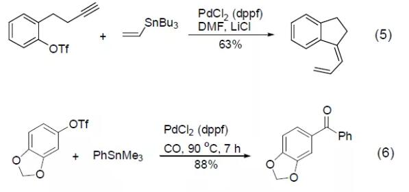 PdCl2 (dppf) reagent can also catalyze Stille reaction and Suzuki reaction, such as the cross-coupling reaction between vinyl tin and aryl trifluoromethanesulfonic acid to obtain an intramolecular cyclization product (Formula 5) [5] , or a cross-coupling reaction between aryltin and aryltrifluoromethanesulfonic acid in a CO atmosphere to obtain an aryl ketone compound (Formula 6) [6]. [Examples of preparation of carboxylic acids and their derivatives by carbonyl insertion reaction]