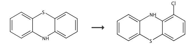 Cool a solution of phenothiazine (10.0g, 50.18mmol) in anhydrous THF (200mL) to -78°C, and add n-butyllithium (24.1mL, 60.2mmol, 2.5M hexane solution) dropwise. The mixture was stirred until a yellow precipitate formed and then allowed to warm to room temperature until a clear yellow solution was obtained. The solution was again cooled to -78°C and CO2 gas was bubbled through the mixture for 5 minutes. The resulting solution was allowed to warm to RT and the solvent was evaporated to give a residue. The residue was again dissolved in anhydrous THF (200 mL) and cooled to -78 °C, then t-BuLi (50 mL, 85 mmol, 1.7 M in pentane) was added dropwise. The resulting mixture was warmed to -20°C and stirred at this temperature for 2 hours. The reaction mixture was cooled again to -78°C and a solution of hexachloroethane (100 mmol) in THF (50 mL) was added dropwise. The mixture was stirred at this temperature for 1 hour, then allowed to warm to -20°C and stirred for 2 hours. The reaction mixture was quenched with ice-cold IN HCl and extracted with EtOAC. The combined organic layers were washed with brine, dried over MgSO4, filtered and evaporated to give a residue. The residue was purified by flash silica gel chromatography to give 1-chlorobenzothiazine as a beige solid.